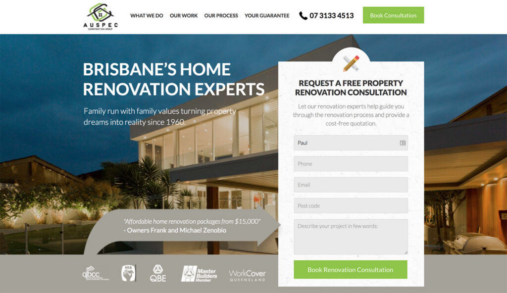 A/B tested 3 headline variations focusing on ‘Free Consultation’ vs ‘Expert Renovation’ vs ‘Trusted Local Contractor’. - On-page social proof: case studies and testimonials.